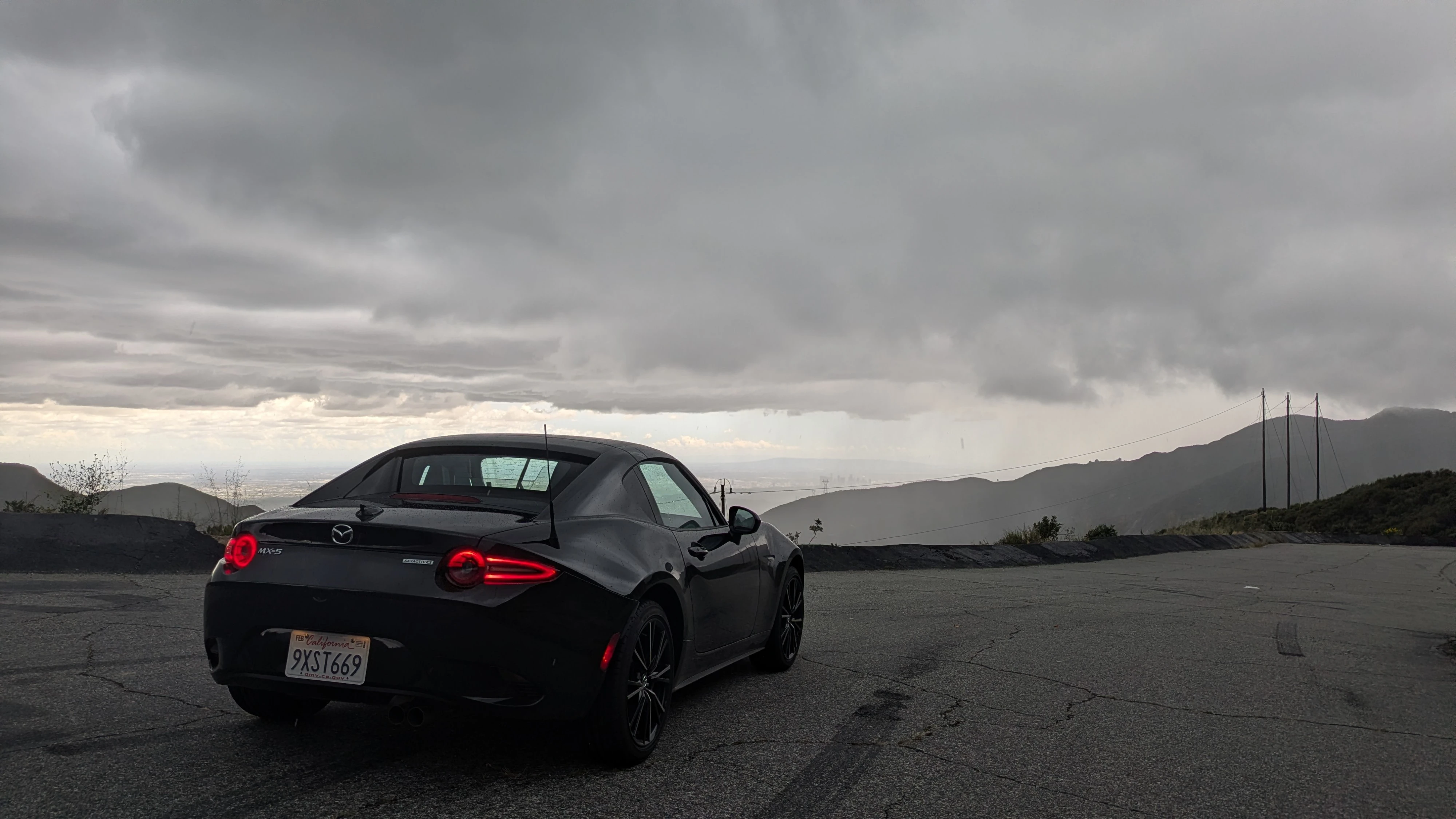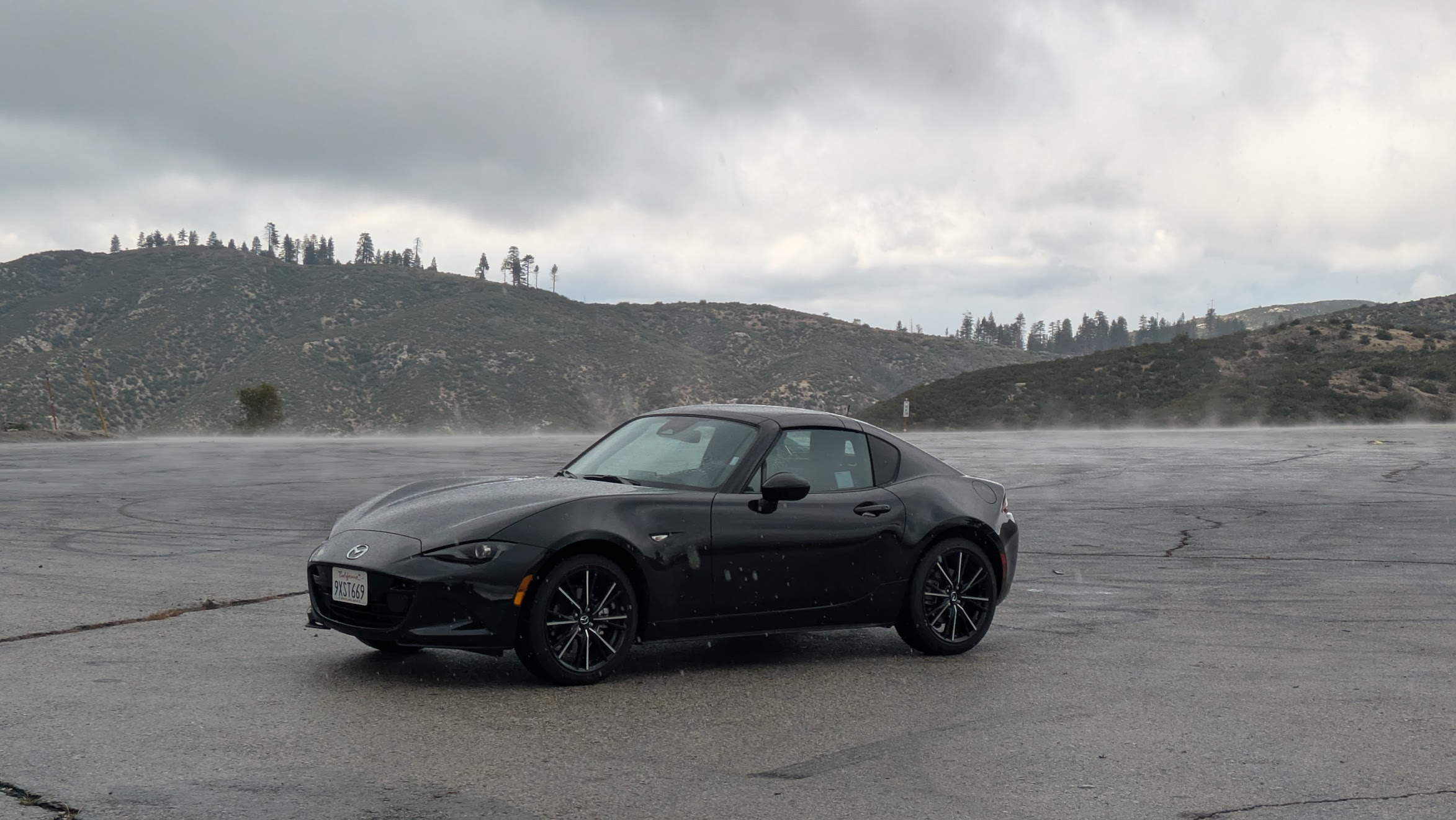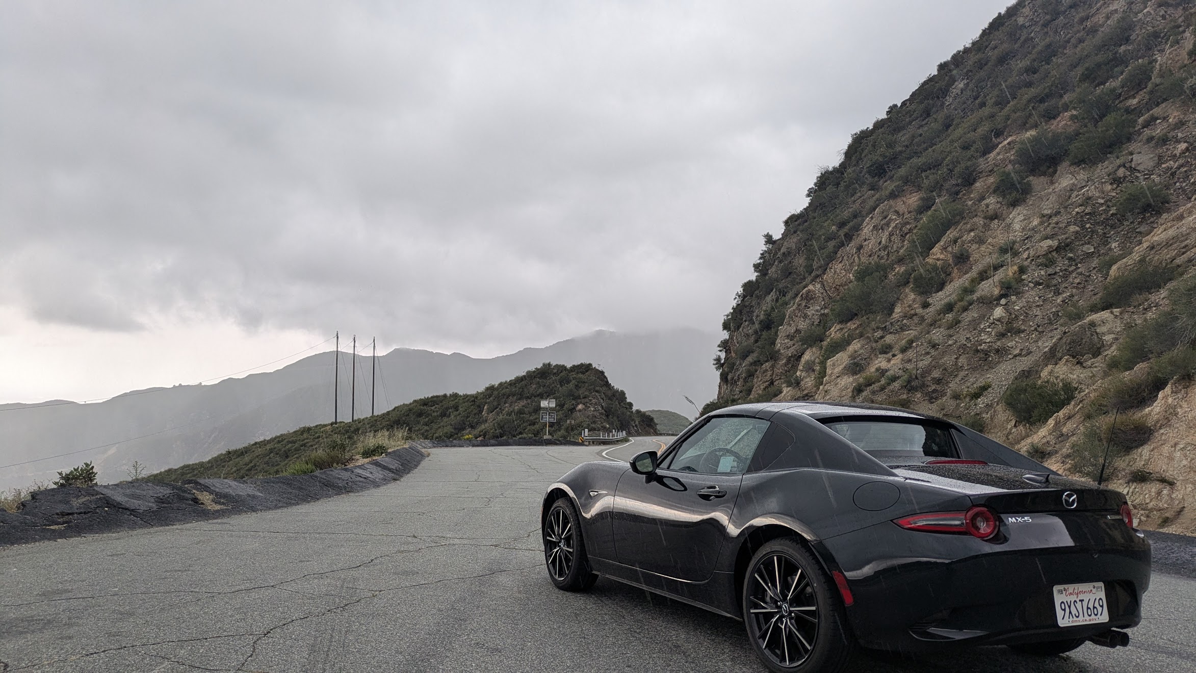But I wanted to take some photos. I was anxious to find a scenic enough pullout spot, and I eventually found a very large one. The concrete was still warm from the sun, and the sudden rain meeting it was evaporating off the surface - steam rising from the ground. I parked the Miata in the middle and took a very cool photo