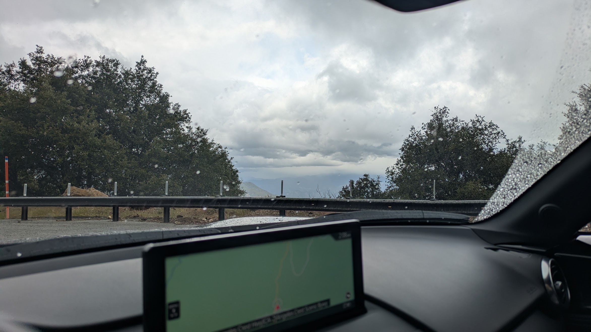 Then the rain really really started. I wasn't particularly worried even as the rain turned into small hail pellets, the road got wetter, and the automatic wipers went faster and faster to keep up with the deluge. I also wasn't particularly worried as I went lower and lower in elevation, the rain getting thick enought to come down in sheets, obscuring my vision for a second or two at a time as I was still above 3000 feet. What I was really concerned about were the motorcyclists who were going UP into that mess. I also started to wonder if I was using the brakes too much, which would lead to brake fade and eventually flying off the cliff.
