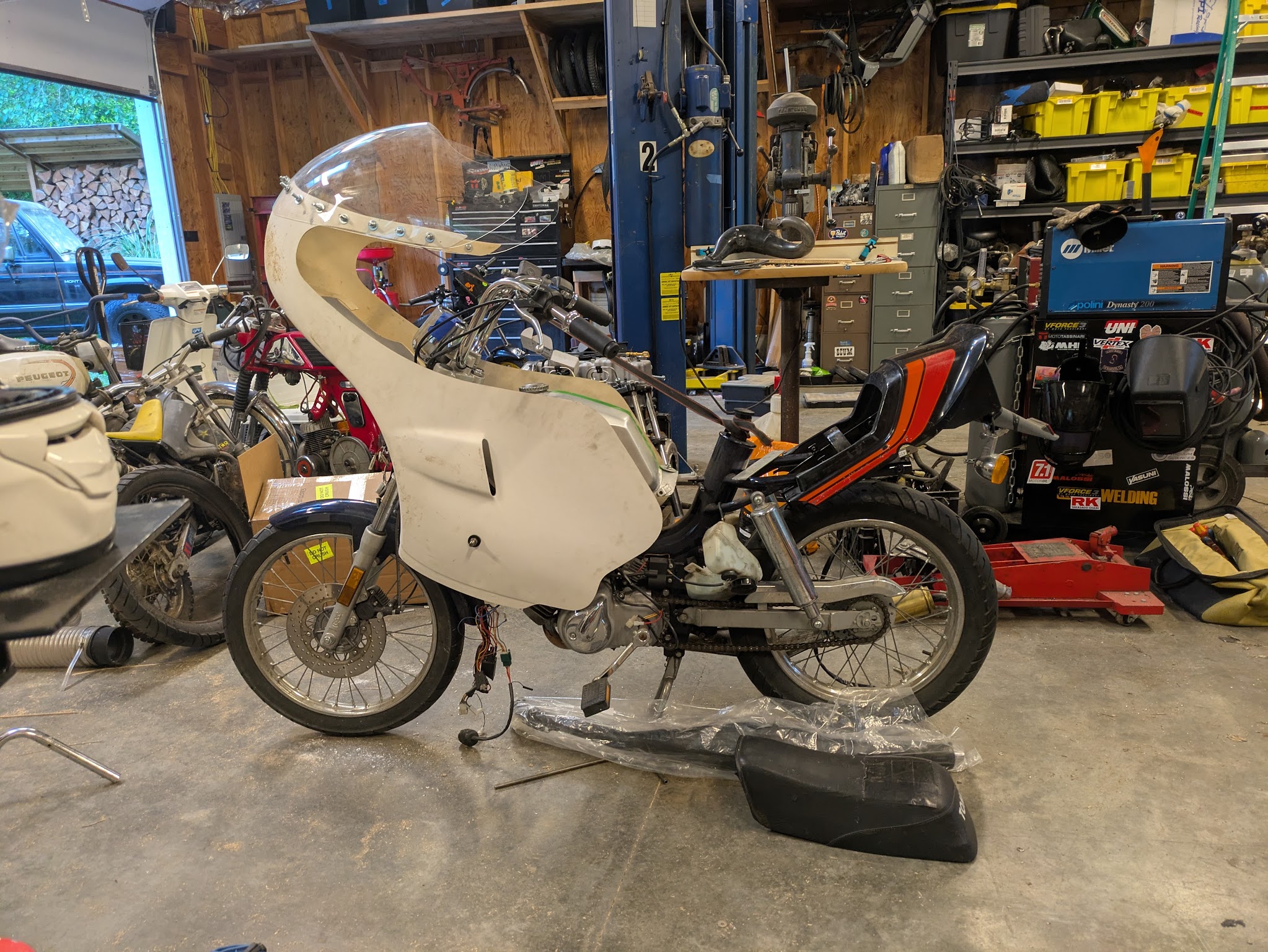 Currently the rest of the fairing has to be attached to the bike by my friend who has experience in doing incredibly fucked up things to bikes and mopeds so I trust em to do it. Once that ordeal is done I will have to disassemble the entire bike to modify the frame, then figure out a seat, and then paint and reassemble. I suppose if I am singular about this bike I can get it finished by summer.