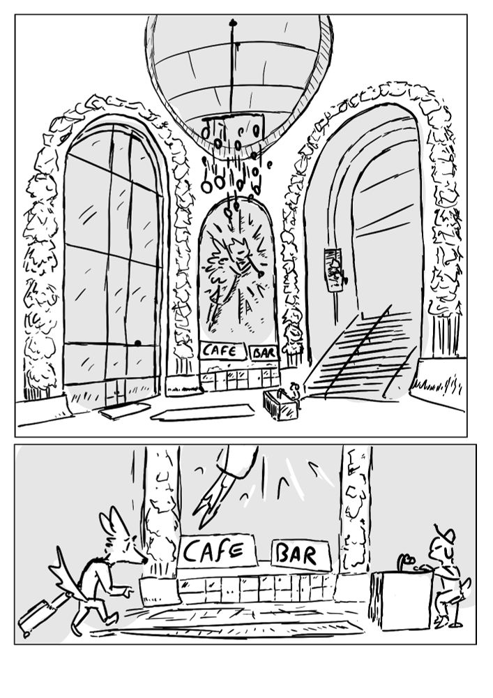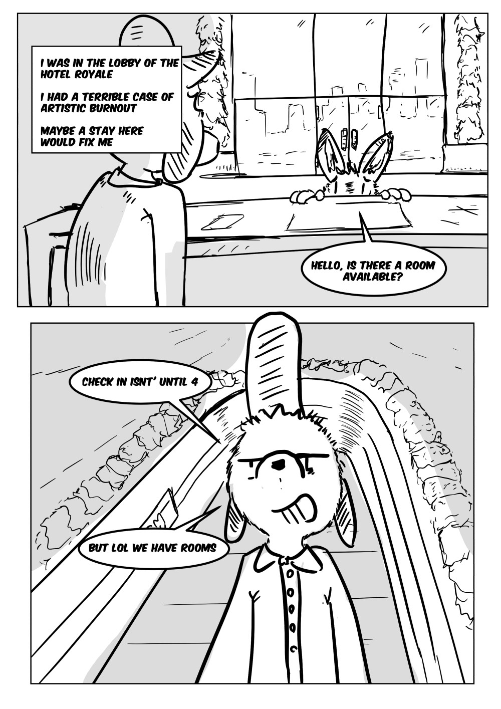 Later that same weekend I was again at a coffee shop and was going over random prompts. I wanted to start drawing comics again but I didn't know where to start. One of the prompts was a "Hotel Lobby" and I sort of took it from there